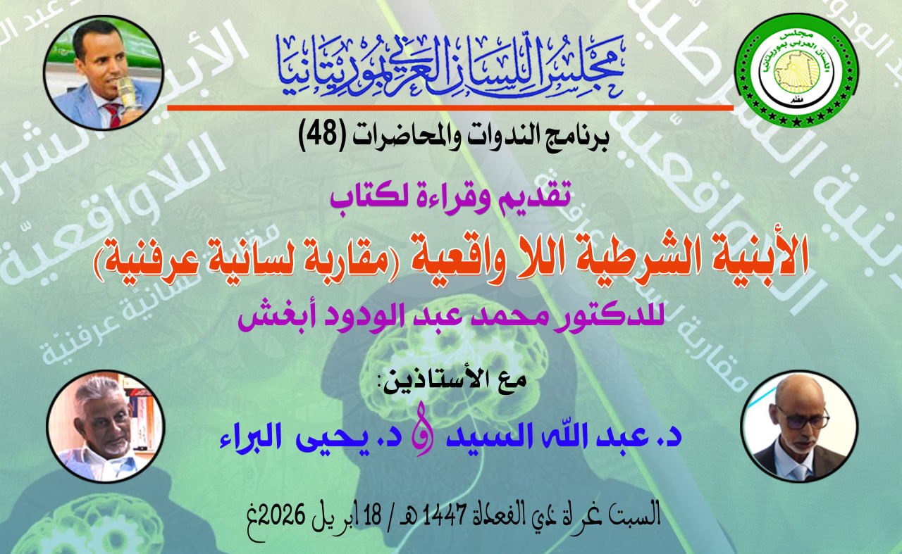 احتضن مجلس اللسان العربي بموريتانيا، صباح السبت غرة ذي القعدة 1447هـ/ الموافق 18 أبريل 2026غ، ندوة علمية لتقديم وقراءة كتاب «الأبنية الشرطية اللاواقعية (مقاربة لسانية عرفنية)» للدكتور محمد عبد الودود أبغش، بحضور نخبة من الأساتذة والباحثين.